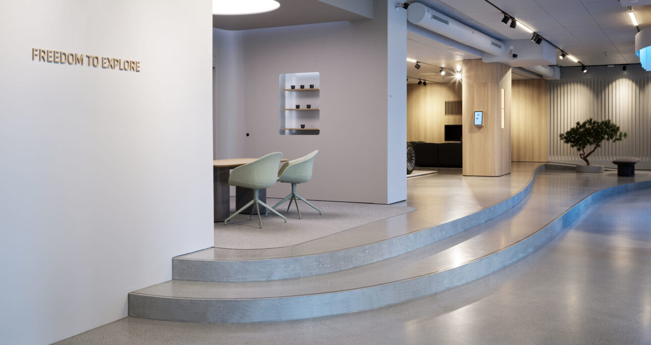 When we designed the Voyah Showroom in downtown Oslo, our ambition was to create a space that redefines how people encounter an automotive brand. Instead of following the traditional dealership model, we shaped the interior as a curated, contemporary environment where Scandinavian minimalism meets the expressive identity of Voyah. The topographic floor plan — inspired by contour lines on a map — forms a stylized landscape that invites visitors to move upward through a sequence of experiences, each level revealing a new perspective on the brand.